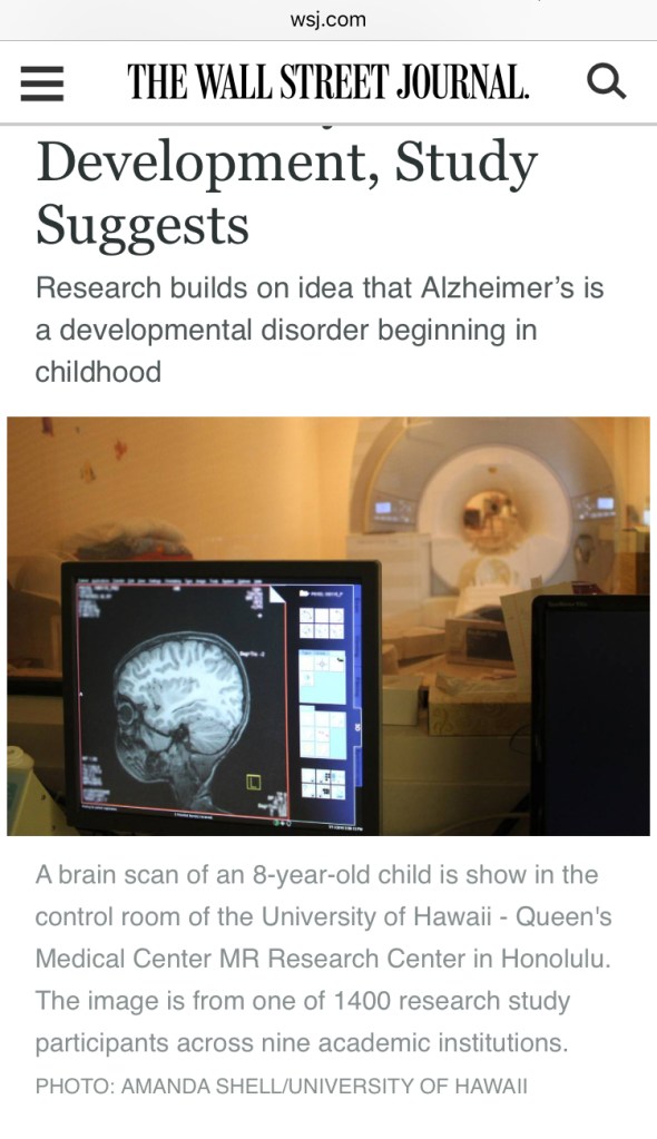 Photos featured in the online Wall Street Journal article “Alzheimer’s Effects on the Brain Found in Young People,” published on July 13, 2016.